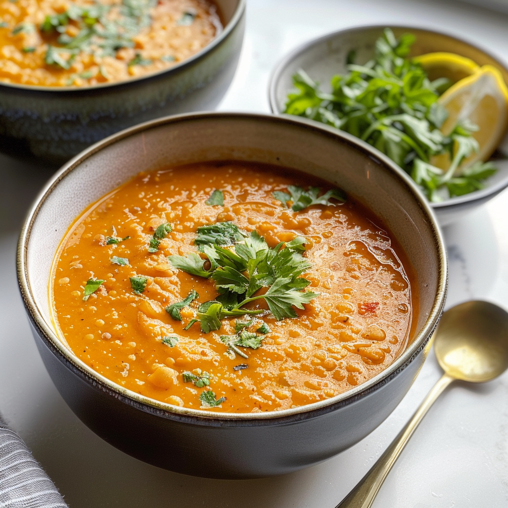 Start by sautéing onions and garlic in olive oil until fragrant. Then, add the red lentils and vegetable broth, letting them simmer until tender. Blend it all for a creamy texture, and season to perfection.