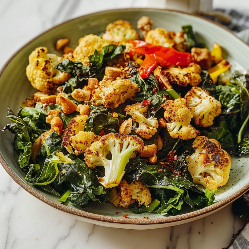 Experience the delightful harmony of Collard Greens & Roasted Cauliflower Medley, where tender collard greens meet perfectly roasted cauliflower. This vibrant dish, rich in flavor and nutrients, is easy to prepare and makes for an impressive addition to any meal. Ideal for cozy dinners or festive gatherings, it promises to please both the palate and the eye.