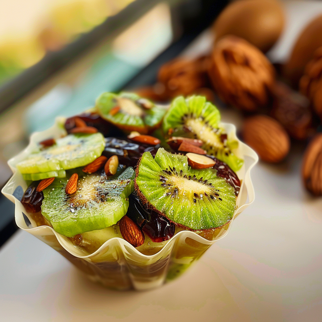 - In a clear glass or bowl, layer Greek yogurt at the bottom, followed by sliced kiwi, diced dates, and toasted almonds.