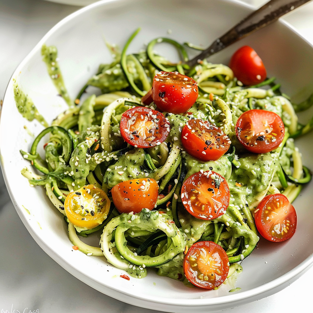 Start by spiralizing your zucchini to create noodles, then set them aside. While prepping the creamy avocado sauce, you can roast cherry tomatoes for added sweetness. Toss everything together for a quick and delicious meal.