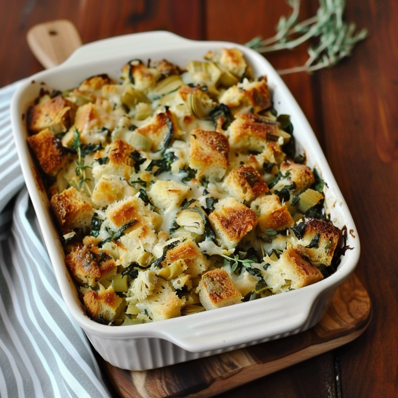 Start by sautéing onions and garlic until they become fragrant. Then, combine the spinach and artichokes in a large bowl while your bread cubes toast in the oven. Mix everything together with broth and seasonings before baking to perfection.